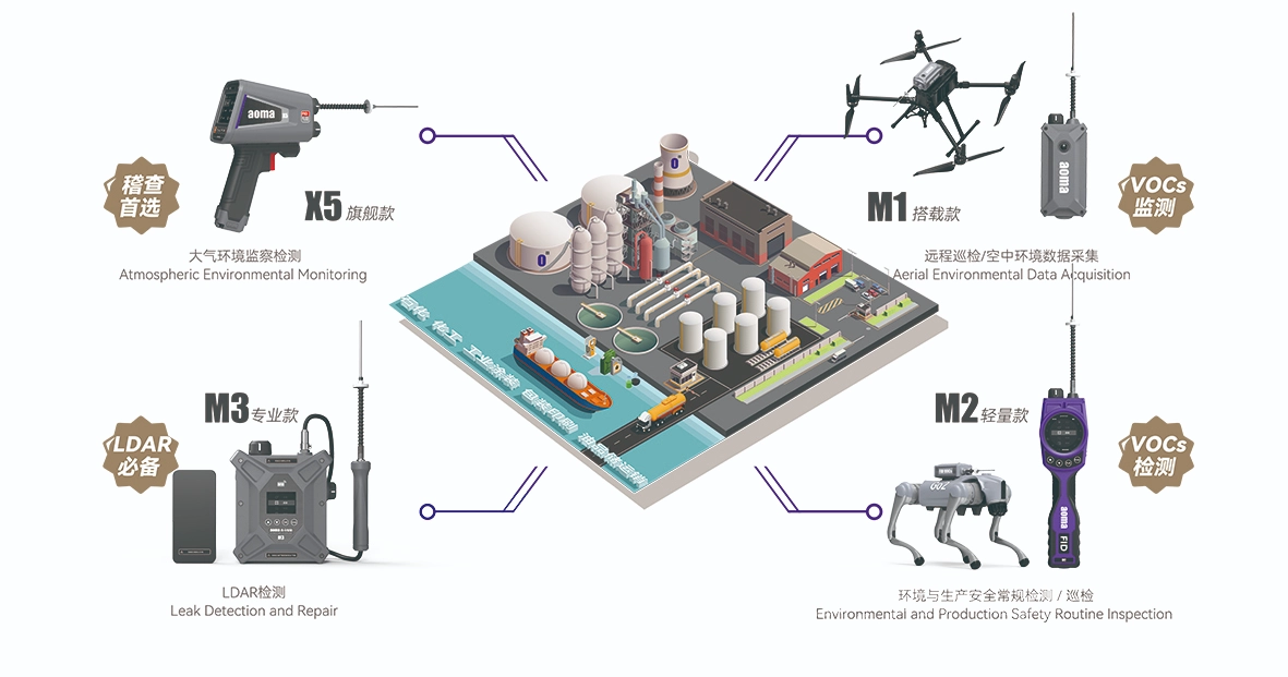 Omar Intelligence has developed a “Human-Ground-Air Integrated” full-scene monitoring solution in response to the challenges of fugitive emission scenarios in the chemical industry. This solution encompasses personal handheld devices, professional portable equipment, and mobile inspection systems, providing precise coverage of key scenarios such as daily patrol inspections, LDAR periodic detection, production unit area monitoring, and plant boundary/exit point monitoring.